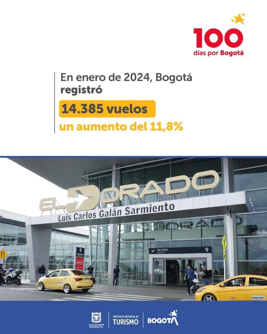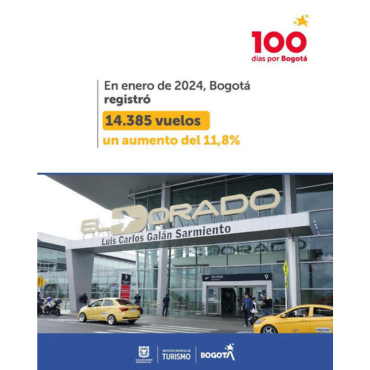 2.- Incremento en conexiones aéreas: Bogotá continúa siendo un destino atractivo para viajeros de todo el mundo, como lo demuestra el aumento del 11,8% en los vuelos hacia la ciudad registrados en enero de 2024. Con 14.385 vuelos, la conectividad aérea de Bogotá se fortalece, consolidándola como un