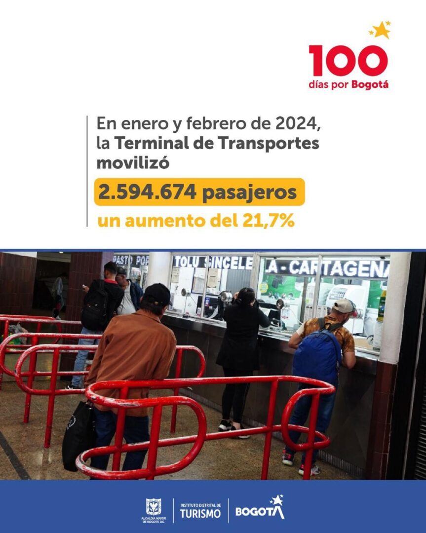 1.- Aumento significativo en la Terminal de Transportes: Durante enero y febrero de 2024, la Terminal de Transportes de Bogotá experimentó un impresionante incremento en la cantidad de pasajeros, alcanzando un total de 2.594.674 viajeros. Este aumento del 21,7% en comparación con el año