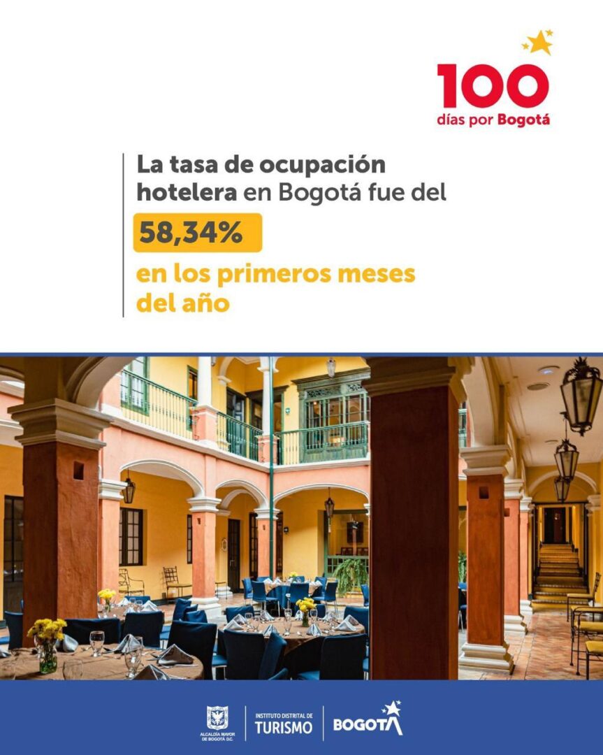 5.- Resiliencia en la industria hotelera: A pesar de algunos desafíos, la tasa de ocupación hotelera en Bogotá se mantiene robusta, registrando un 58,34% en los primeros meses del año, según datos de COTELCO. Esta cifra, aunqueligeramente menor que en períodos anteriores, sigue estando por encima delpromedio nacional, destacando la fortaleza y la resiliencia del sector turístico