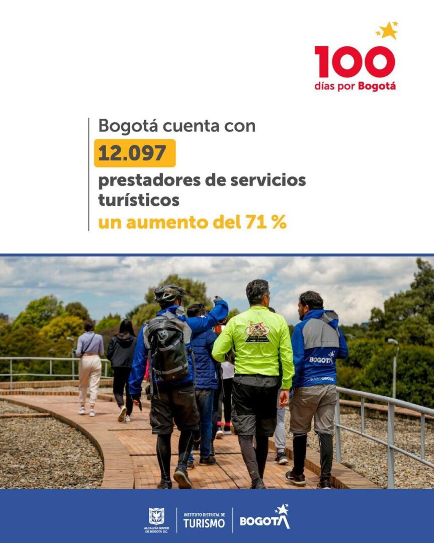3.- Crecimiento exponencial en servicios turísticos: La ciudad ha experimentado un notable crecimiento en el sector turístico, con un incremento del 71,0% en el número de Prestadores de Servicios Turísticos con Registro Nacional de Turismo, alcanzando la cifra de 12.097. Este aumento refleja el compromiso de Bogotá con la excelencia en servicios turísticos y la mejora continua de la experiencia del visitante.