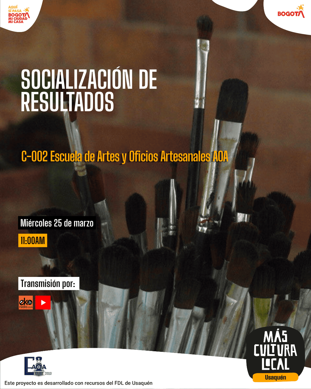 El miércoles 25 de marzo a partir de las 11:00 am te invitamos a conocer los resultados obtenidos por parte de la Escuela de Artes y Oficios Artesanales de Usaquén AOA, este es un proyecto de «Más Cultura Local de Usaquén», bienvenidos.