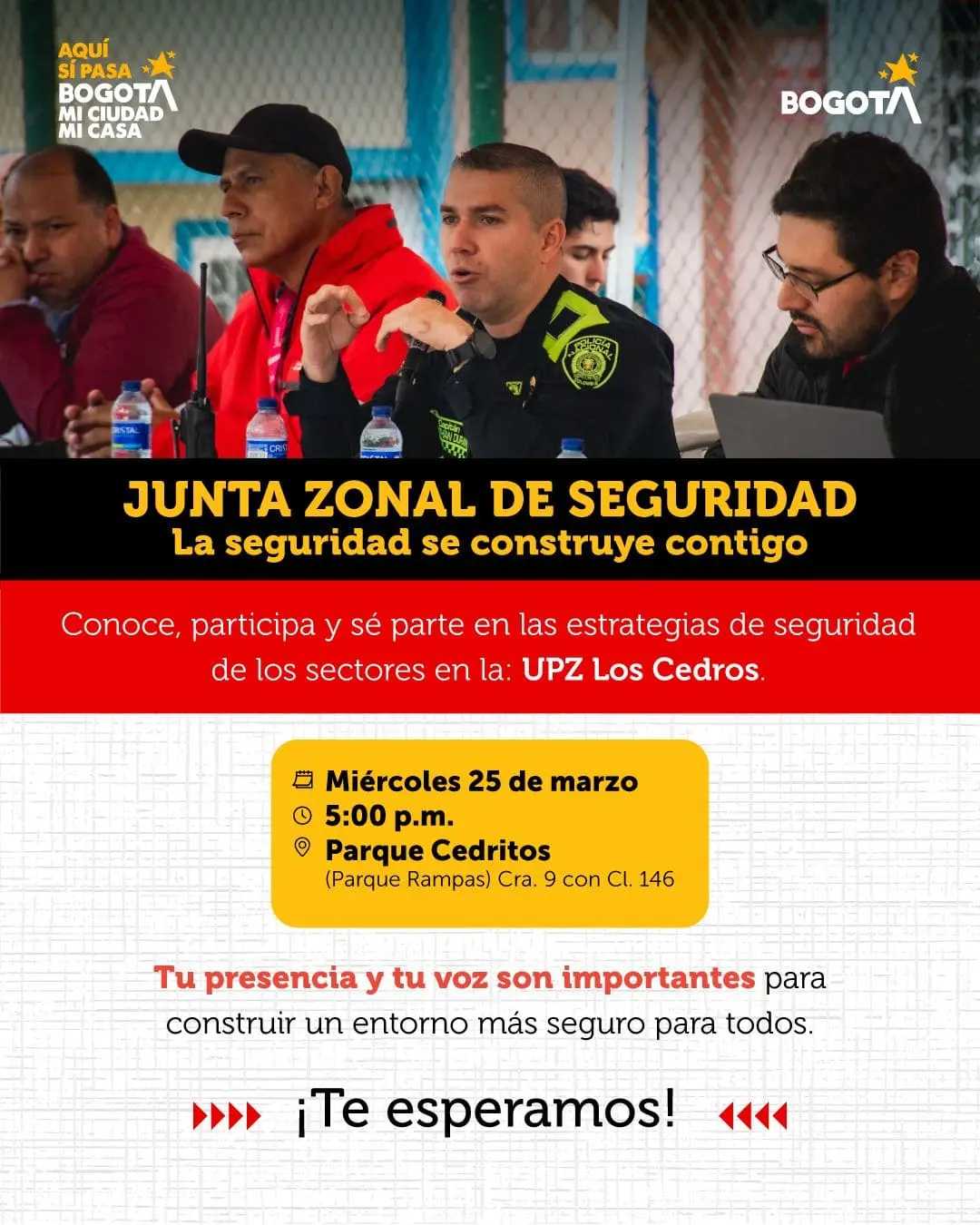El miércoles 25 de marzo a las 5:00 pm en el Parque de Cedritos (Parque Rampas) Carrera 9 con calle 146, conoce, participa y sé parte en las estrategias de seguridad de los sectores en la UPZ Los Cedros.